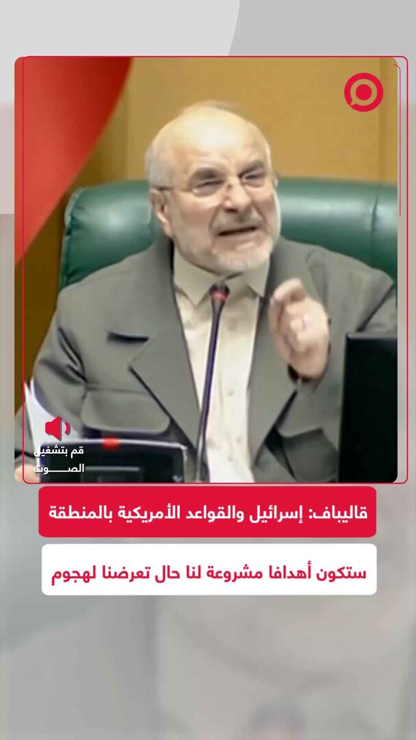 Play/Pause Mute/Unmute رئيس البرلمان الإيراني يحذر واشنطن ويعدّ بالقواعد الأمريكية وإسرائيل أهدافًا مشروعة لأي هجوم Save post Share Facebook X VK.com Telegram
