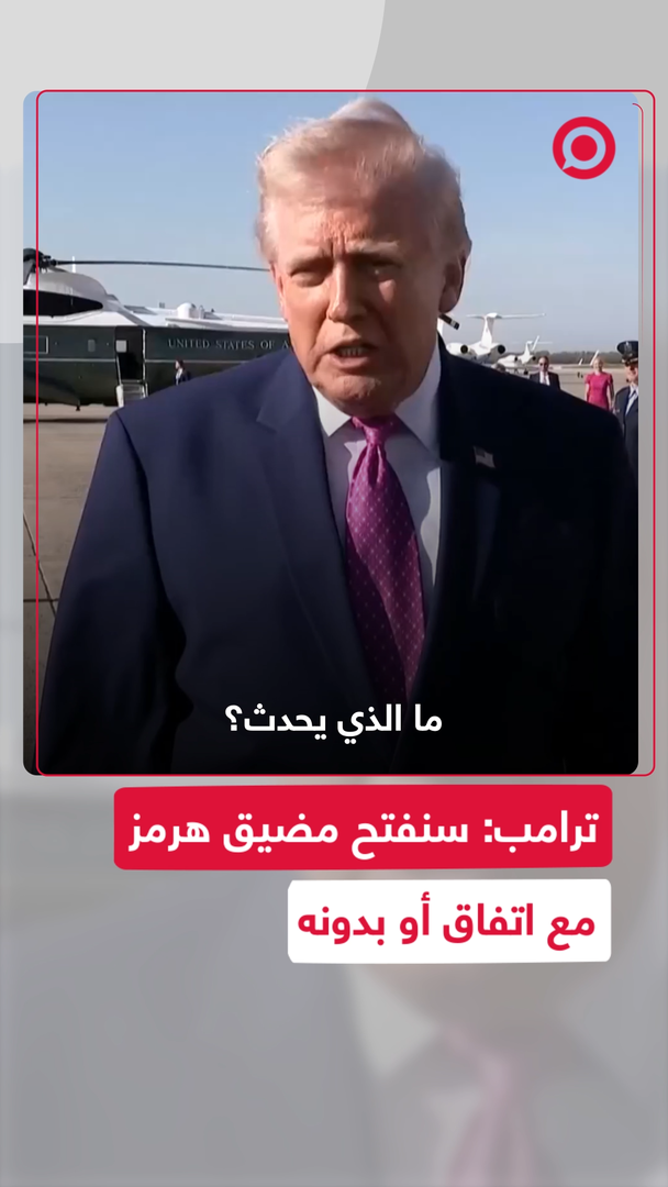 Play/Pause Mute/Unmute ترامب: سنفتح مضيق هرمز مع اتفاق أو بدونه Save post Share Facebook X VK.com Telegram